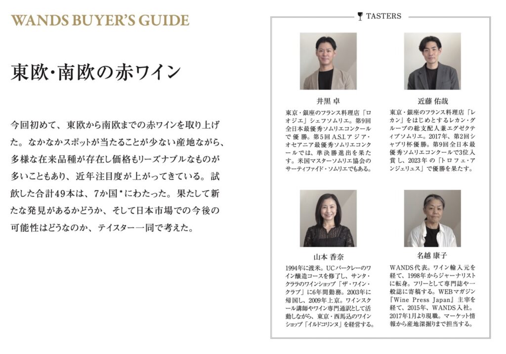 今回初めて、東欧から南欧までの赤ワインを取り上げた。なかなかスポットが当たることが少ない産地ながら、多様な在来品種が存在し価格もリーズナブルなものが多いこともあり、近年注目度が上がってきている。試飲した合計49本は、7か国*にわたった。果たして新たな発見があるかどうか、そして日本市場での今後の可能性はどうなのか、テイスター一同で考えた。