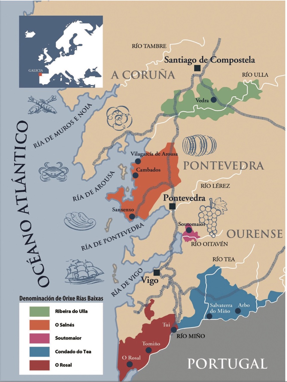 「サン・ペドロとサン・フアンの祭りの時期を、ワインは最も怖がっている」。ボデガス・テラス・デ・ランターニョで試飲した時、古い諺を教えてもらった。6月24日、夏至にはスペイン各地でサン・フアンの火祭りが催される。ガリシア州ではその5日後、サン・ペドロ祭が続く。人々は浜辺でサルディーナ(イワシ)を焼き、ワインで盛り上がる。だが、ブドウ栽培家は盛り上がっていられない。アルバリーニョの果実が膨らみ始めるこの時期は、霧が出やすい。ベト病のリスクが一段と高くなるのだ。「この数週間の管理が、その年の収量と品質を決める」という。