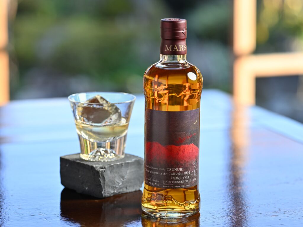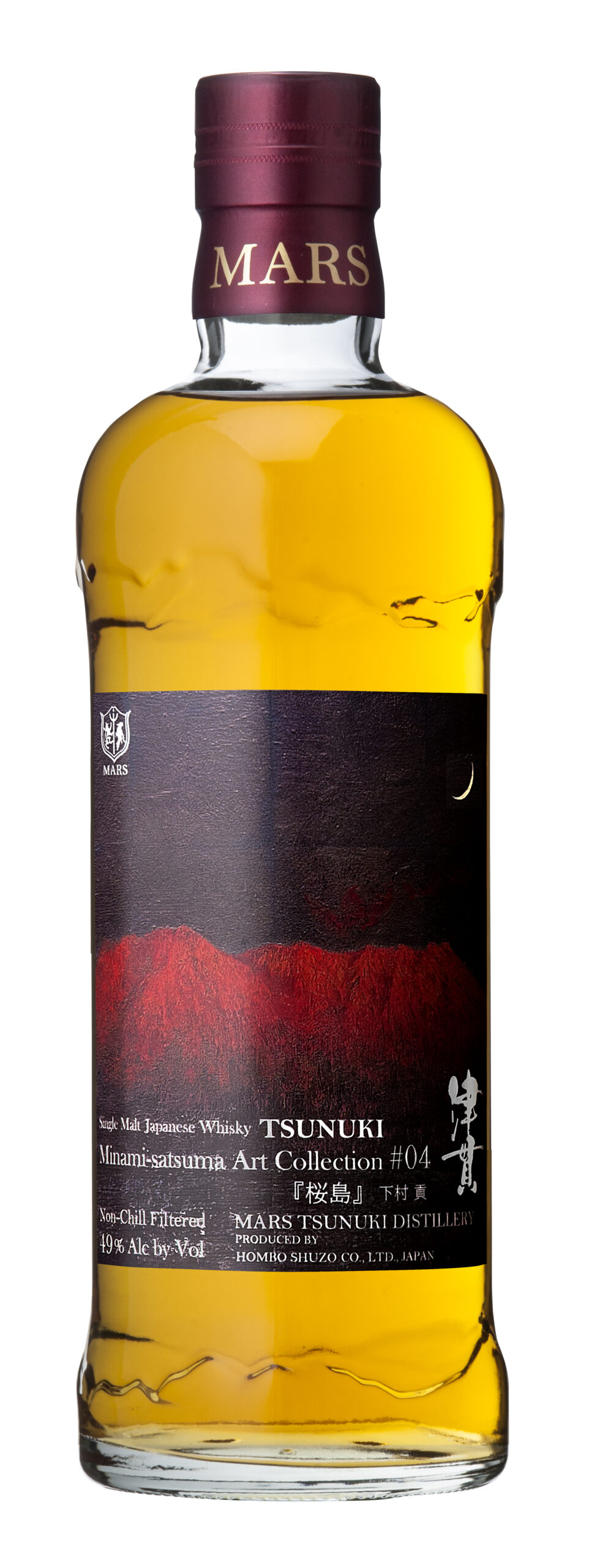 「シングルモルト津貫 Minami-satsuma Art Collection #04」は南さつま市をテーマにした作品や、同市出身の作家による作品をラベルに使用したアートラベルシリーズ。第4弾は南さつま市出身の日本画家、下村貢氏の作品「桜島」をラベルに使用した。
